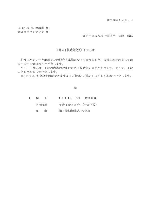 1月の下校時刻の変更について配布された通知を掲載いたします。