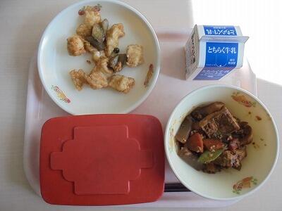 今日の給食の献立は、【ごはん・牛乳・チキンチキンごぼう・肉味噌おでん】でした。