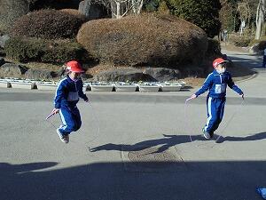 体育の時間、1年生は昇降口前で縄跳び運動をしていました。