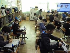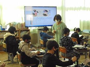 欠席している友達は、タブレットでオンラインで同時に学習しています・・・