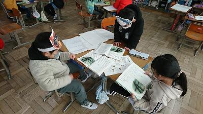 今日まで物語を読み込み、3人組になって好きな場面を役になり切って音読の発表をします。
