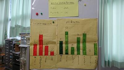 4年生のおやつの取り方についてアンケートをとり、そのことをグラフにして発表しました。
