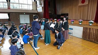 修了式の後、児童指導主任が春休みの過ごし方について話をしました。