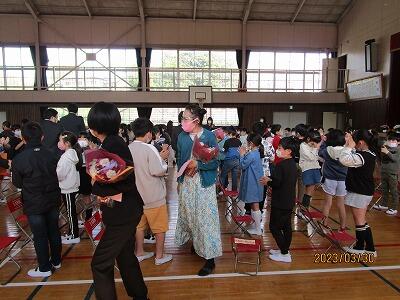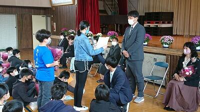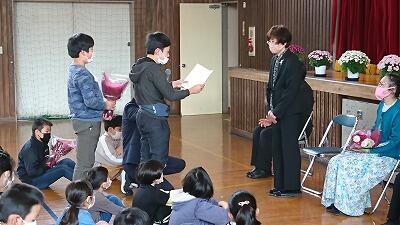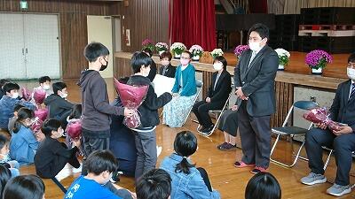 次に代表児童から、お一人お一人へお別れの言葉と花束を贈りました。