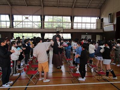1~4年生にとっては、お世話になった6年生への感謝の心をもち、卒業を祝う気持ちを表すことをねらいに、6年生にとっては、1~4年生との思い出を振り返り、別れを惜しみつつ、母校の伝統を引き継ぐ気持ちをもつことをねらいに行いました。