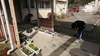 体育館通路には、1年生が育てている鉢花も飾りました。