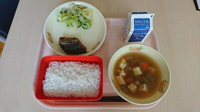 今日の献立は、お魚ランチで、ご飯、魚(さわら)の照焼き、即席漬け、鶏ゴボウ汁、牛乳でした。