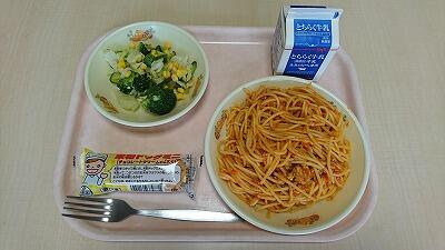 今日の献立は、スパゲティミートソース、イタリアンサラダ、米粉ドック(チョコ)、牛乳でした。