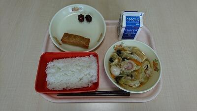 今日の献立は、ご飯、八宝菜、春巻き、アメリカンチェリー、牛乳でした。