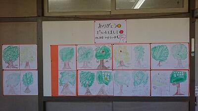 1年生の廊下に「ありがとう どういたしまして の みをつけています」という掲示されています。