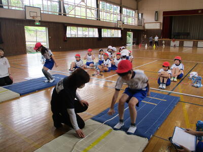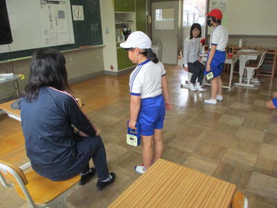 1年生の紹介、じゃんけん列車や〇✕クイズで楽しんだ後、1年生は手作りのメダルを首にかけてもらいました。