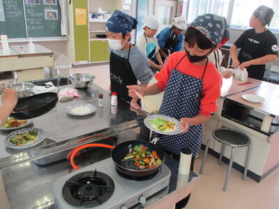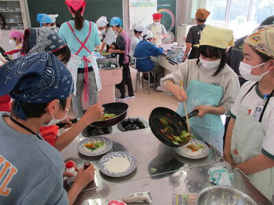 炒めすぎないように気を付けながら調理を進め、最後には自分たちが作った野菜いためをおいしそうに食べていました。