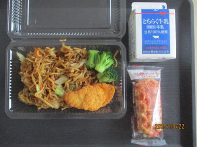 今日のメニューは、焼きそば、牛乳、チキンナゲット、ブロッコリー、原宿ドックでした。