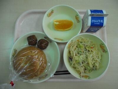 今日の給食の献立は、【バターロール・牛乳・焼きビーフン・肉団子・オレンジ】でした。
