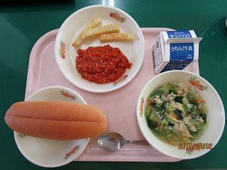 今日の給食は、【スラッピージョー・牛乳・フライドポテト・たまごスープ】でした。
