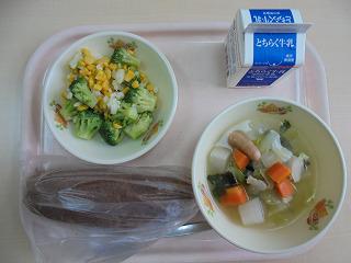 今日の給食の献立は、【ココアあげパン・牛乳・ポトフ・花野菜サラダ】です。