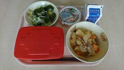 今日の献立は、ご飯、肉じゃが、豆腐サラダ、牛乳でした。
