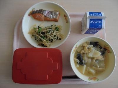 今日の給食の献立は、【ご飯・牛乳・ヤシオマスの浜焼き・にらのおひたし・かんぴょうのみそ汁】でした。
