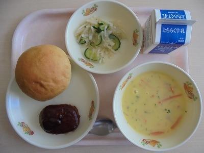 今日の給食の献立は、【丸パン・牛乳・ハンバーグケチャップかけ・コーンポタージュ・大根サラダ】でした。