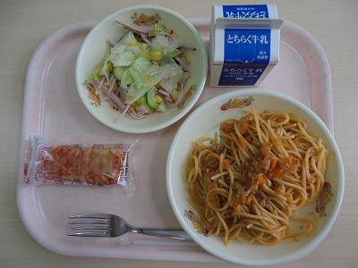 今日の給食の献立は、【スパゲッティミートソース・牛乳・コーンサラダ・チーズドック】でした。