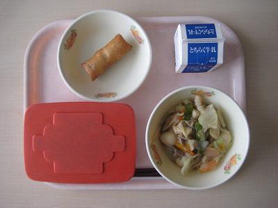今日の給食の献立は、塩(エン)ジョイランチ【ごはん・牛乳・八宝菜・春巻き】でした。