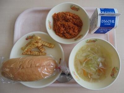 今日の給食の献立は、【コッペパン・牛乳・スラッピージョー・フライドポテト・野菜スープ】でした。