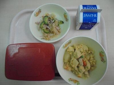今日の給食の献立は、【ごはん・牛乳・親子煮・キムチ和え】でした。