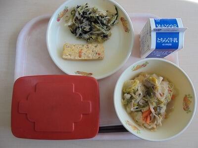 今日の給食の献立は、【ごはん・牛乳・厚焼き玉子・のり和え・すき焼き風煮】でした。