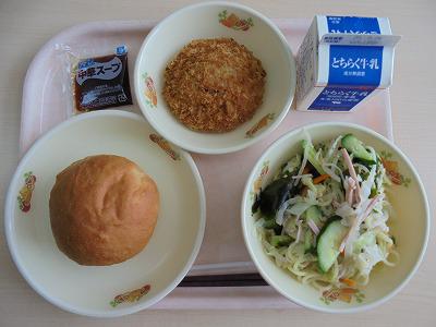 今日の給食の献立は、【ミニ丸パン・牛乳・冷やし中華・ハムカツ】でした。