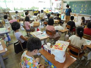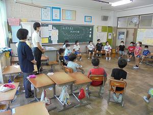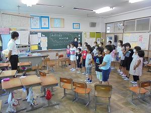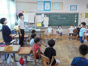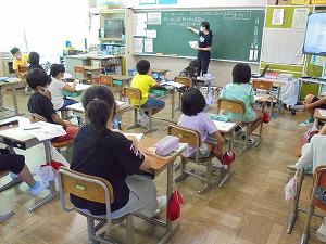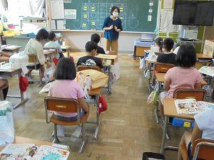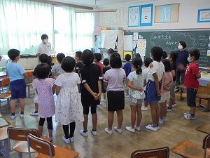 授業の導入部分。先生が、「聞き方名人」の表を使いながら、しっかり聞くことの大切さを話していました。立腰の姿勢で、目でしっかり話を聞いている2年生もいて感心です。
