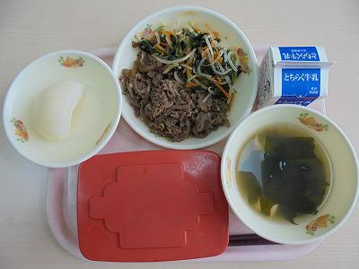 今日の給食の献立は、【ご飯・牛乳・ビビンバの具・韓国風スープ・梨】でした。