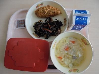 今日の給食の献立は、【ご飯・牛乳・ホッケフライ・磯煮・豆乳仕立ての野菜汁】でした。