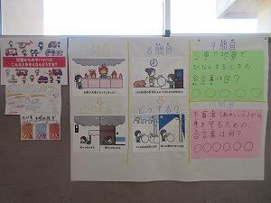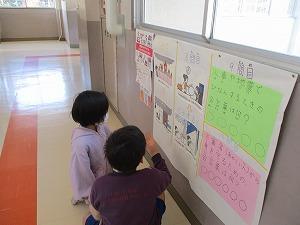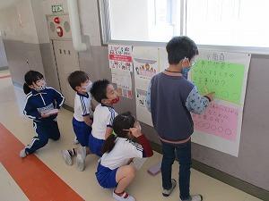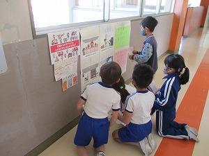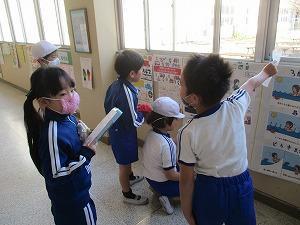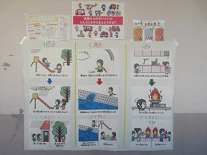 早速、子どもたちは興味を示し、掲示物の前に集まって「防災クイズ」に答えていました。