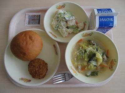今日の給食の献立は、【丸パン・牛乳・メンチカツ・タイピーエン・ポテトサラダ】でした。