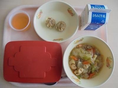 今日の給食の献立は、【ご飯・牛乳・中華丼の具・ポークシュウマイ・手作りゼリー】でした。