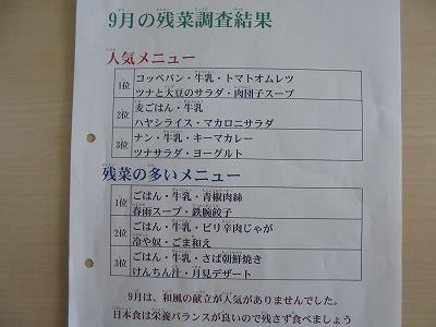 以下に示すとおり、9月は和風の献立に残菜が多かったようです。栄養のバランスがとれている日本食のよさを改めて見直し、残さずに食べるようにしたいものです。