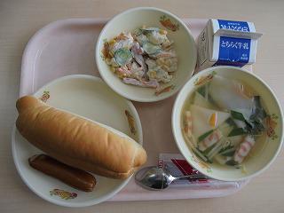 献立のメニューは、【セルフホットドッグ(ソーセージ)・牛乳・ポテトサラダ・ワンタンスープ】でした。