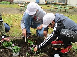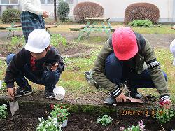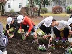 今日のいきいきタイムに、自然愛護委員会の児童が、花壇にビオラとチューリップの苗を植えてくれました。