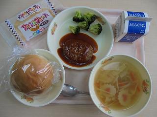 今日の給食の献立は、【まるパン・牛乳・煮込みハンバーグ・ブロッコリー・野菜スープ・チョコクレープ】でした。