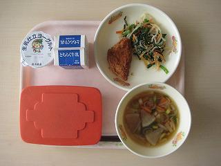 メニューは、【ごはん・牛乳・モロカツのみそソース・にらのおひたし・よしの汁・県産ヨーグルト】でした。