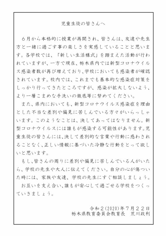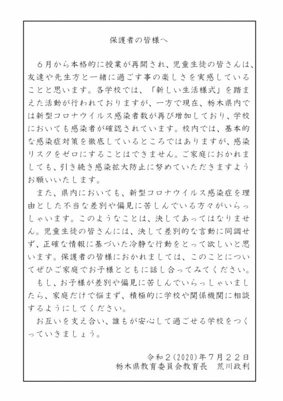 新型コロナウイルス感染症を理由とした不当な差別や偏見の防止に関する県教育長からのメッセージが届きました。