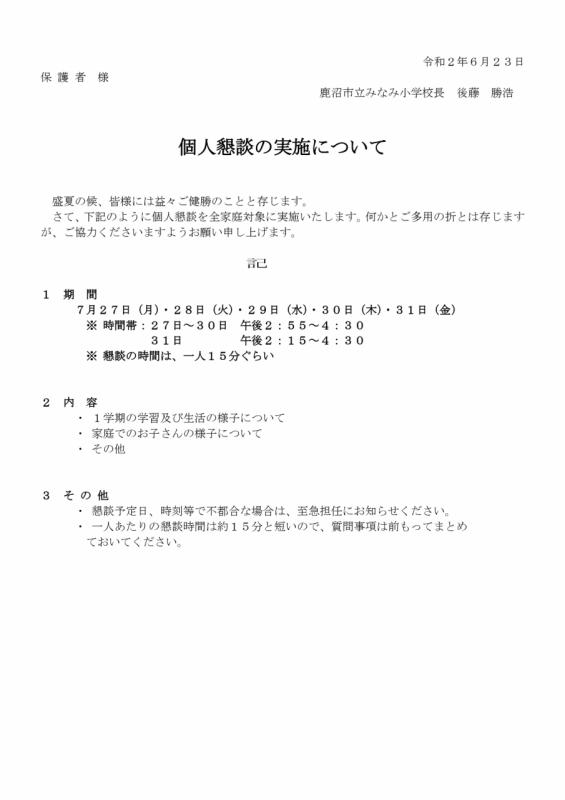 先日、配布しました通知のとおり、本日より個人懇談を行います。