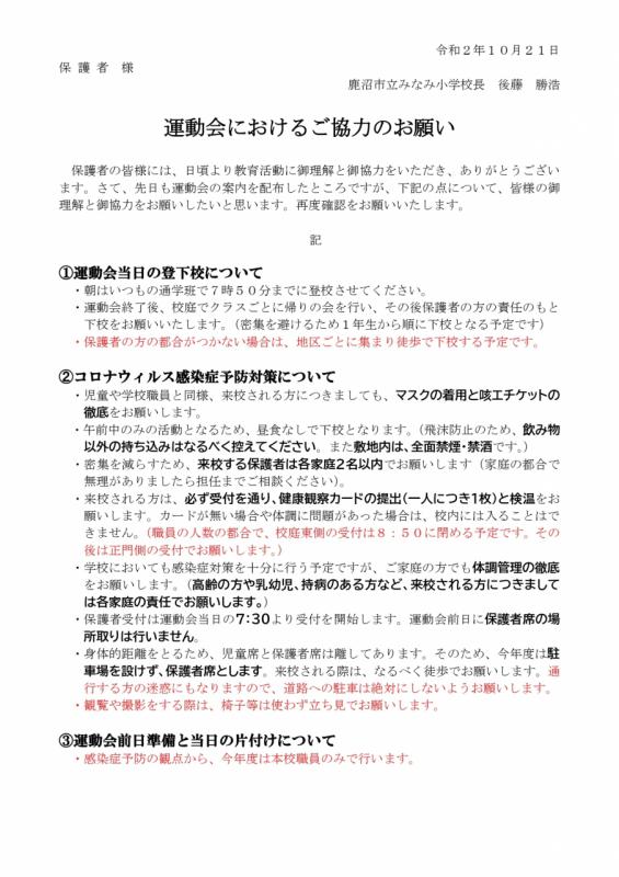 先月、「運動会におけるご協力のお願い」という通知を配布させていただきました。