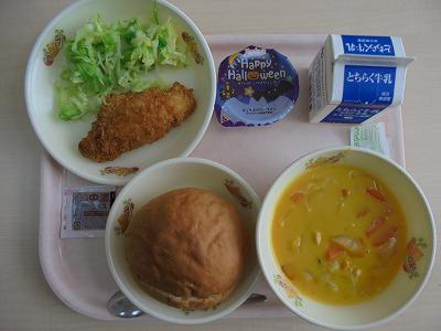 今日の給食の献立は、【丸パン・牛乳・白身魚フライ・ボイルキャベツ・パンプキンシチュー・パンプキンババロアまたはミックスベリープリン】でした。