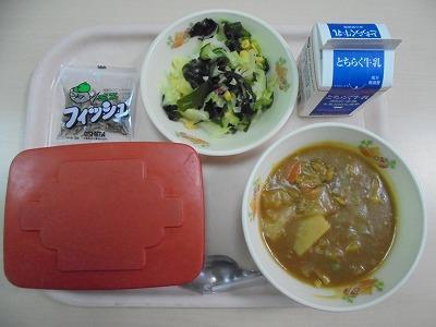 今日の給食の献立は、【大麦ご飯・牛乳・ポークカレー・海藻サラダ・ミニフィッシュ】でした。