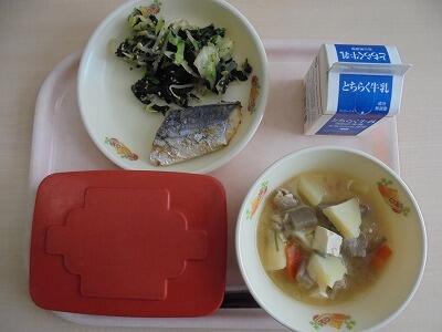 今日の給食の献立は、【ご飯・牛乳・さわらのマヨネーズ焼・のり和え・ぶた汁】でした。