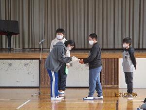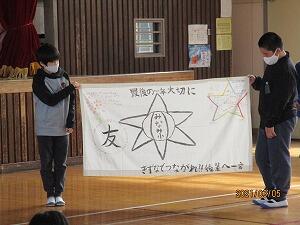 6年生教室に掲示してあった「旗」を5年生に引き継ぐ式を行いました。6年生が先輩から引き継いだ「旗」を5年生に引き継ぐことで、「旗」と共に学校のリーダーとしての役割や自覚を引き継ごうとするものです。