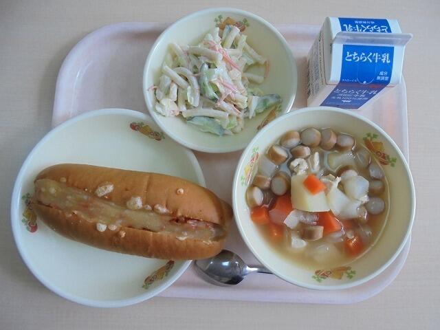 今日の給食の献立は、【ピザドック・牛乳・ポトフ・マカロニサラダ】でした。
