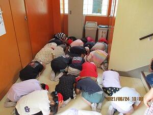 ガラスの飛散を避けられる場所に速やかに避難して、頭を守る姿勢をとる訓練です。