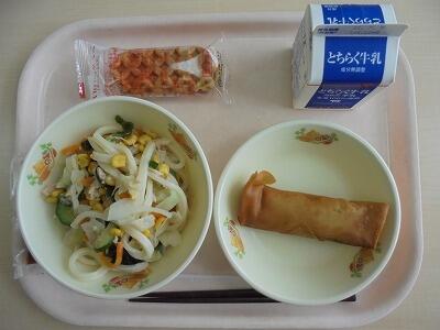 今日の給食の献立は、【サラダうどん・牛乳・春巻き・チーズドック】でした。